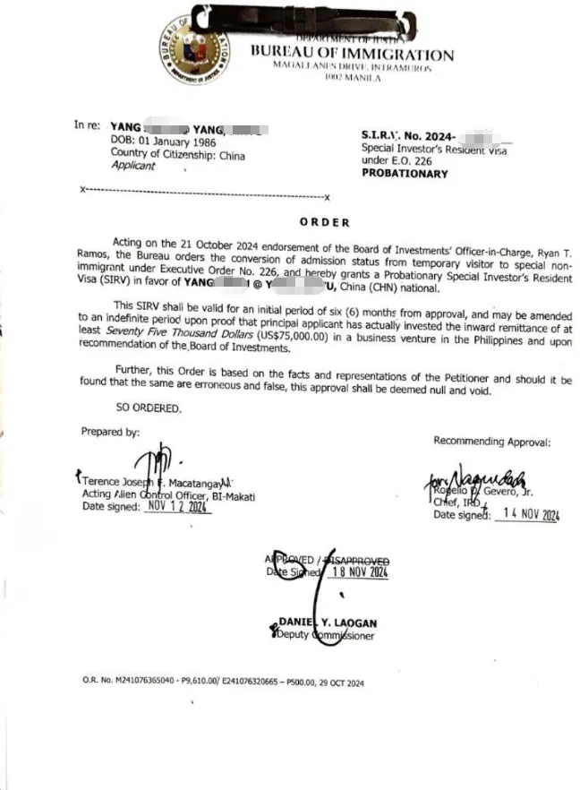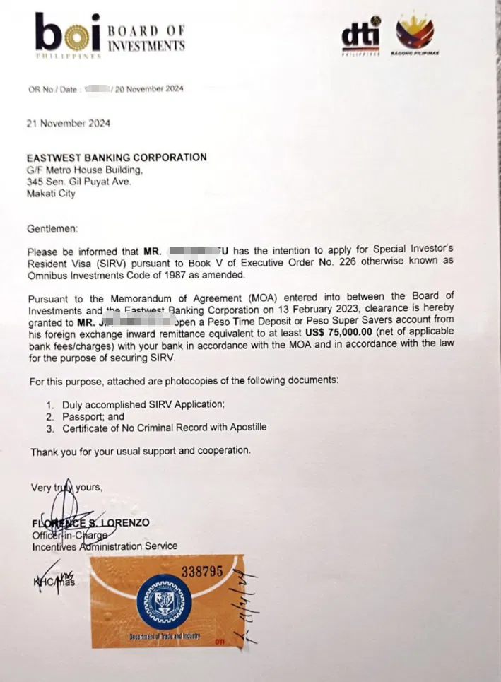 - 能够证明其财务能力,并有意在菲律宾进行合法投资。