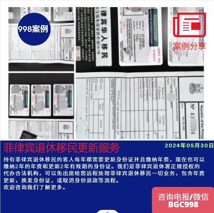 菲律宾政策时常变化,有需要相关业务的亲不妨 联系我们,微 信:BGC998 或 VBW777 电报 @ WOW 888 或 @ BGC 998 或 @VBW777 . 由于业务咨询量比较多,为了节约您的宝贵时间,咨询请主动告知咨询业务和问题,菲律宾 998 华 人 移民顾问 是菲律宾MAKATI 实体注册公司,在菲律宾已经有超过18年服务经验,客户 隐私安全保护服务可靠,业务提交可以安排工作人员上门取件或前往我们办公室提交 。