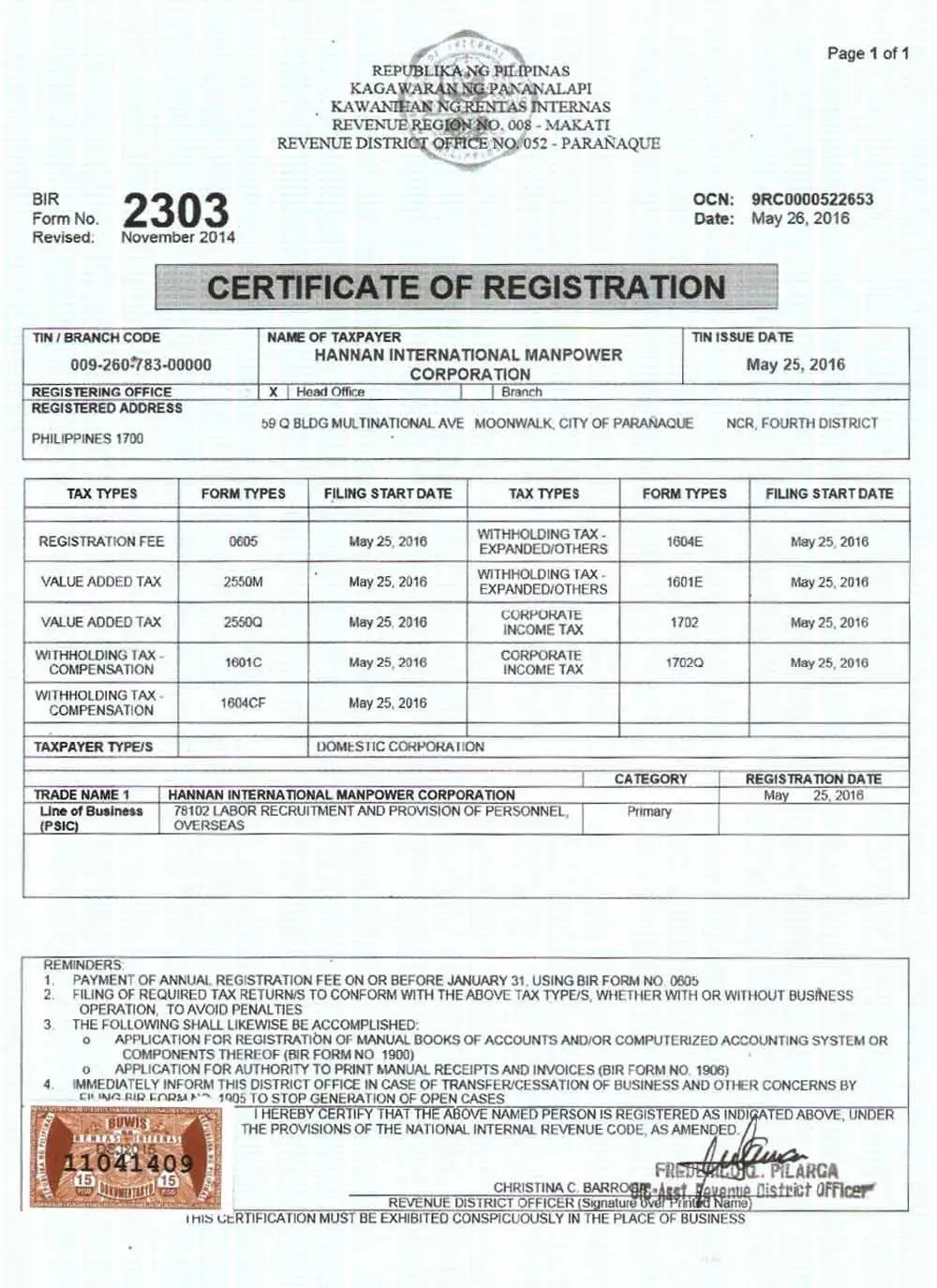 BIR颁发的注册证明(BIR表格2303)包含需要向政府支付的税种的枚举,其中包括: